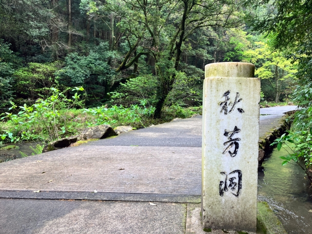 ひんやりと肌をさす冷気漂う杉木立を通り抜けると、秋芳洞の入口へと続きます。