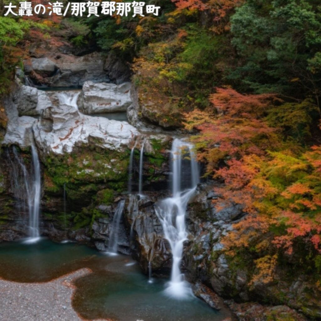 落差約20mから3段に流れ落ちる豪快な滝と紅葉のコラボレーション。