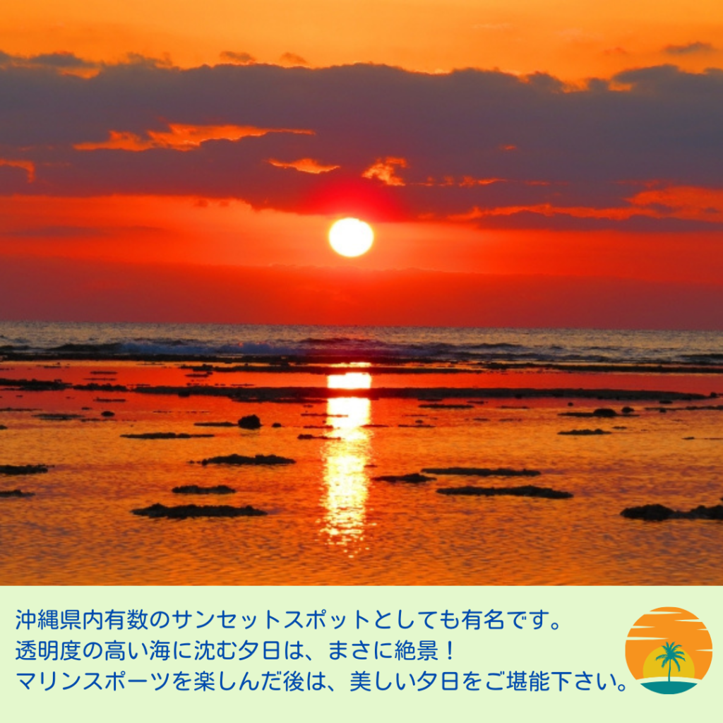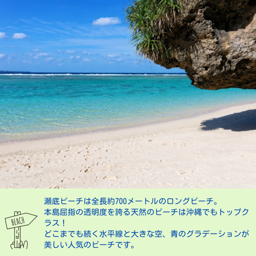 本部港の西に見える周囲約8km、車で行ける離島として人気の瀬底島。本島屈指の透明度を誇る天然の瀬底ビーチは沖縄でもトップクラス!どこまでも続く水平線と大きな空、青のグラデーションが美しい人気のビーチです。